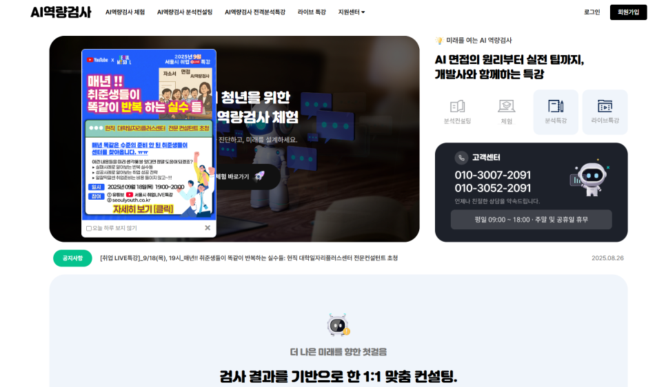 서울시 청년을 위한 무료 AI 역량검사 체험 AI로 나의 역량을 진단하고, 미래를 설계하세요. 미래를 여는 AI 역량검사 AI 면접의 원리부터 실전 팁까지, 개발사와 함께하는 특강 더 나은 미래를 향