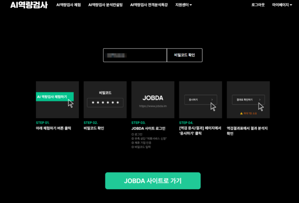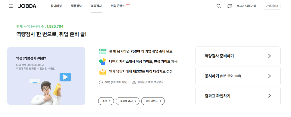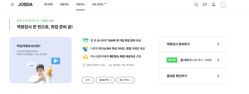 그렇기 때문에 잡다 홈페이지에서는 미리 역량검사를 연습할 수 있도록 제공하고 있어요.