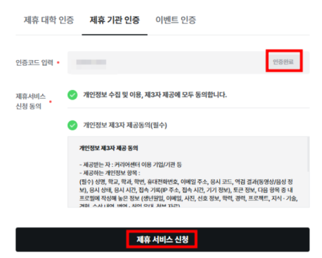 인증 완료가 뜨면 제휴 서비스 신청 클릭!