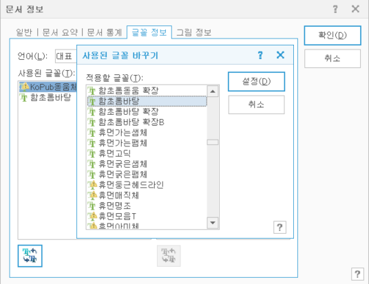 중간쯤에서 [함초롬바탕] 찾아 선택 후 설정 클릭