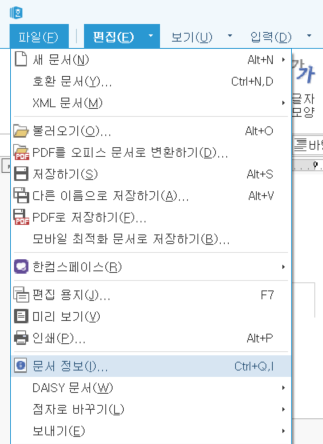 한컴의 [파일] 탭 > [문서 정보] 클릭